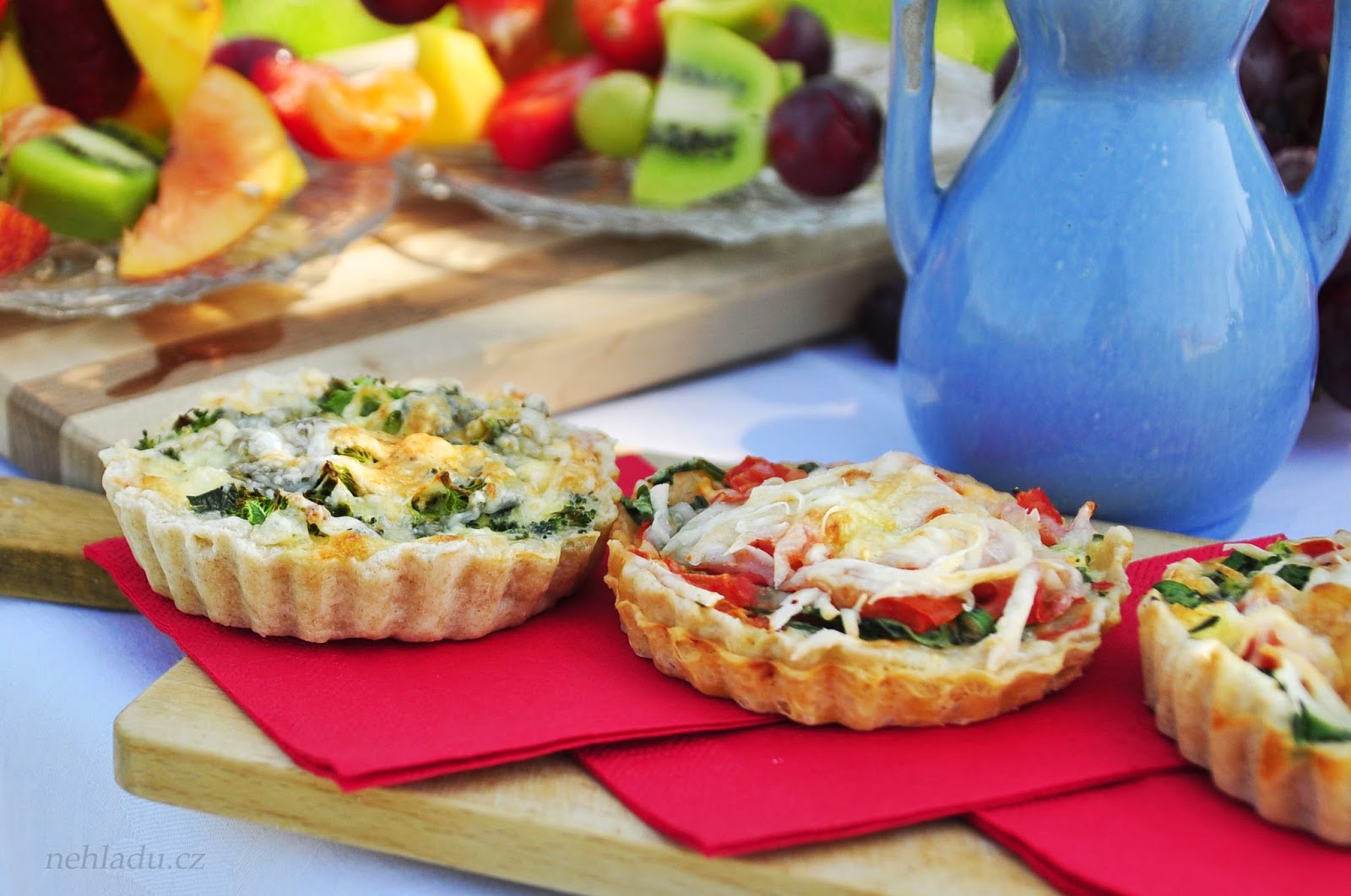 Tři různé mini quiche – s brokolicí, špenátem a rukolou. Jedno z našich nejoblíbenějších jídel, protože se dá donekonečna obměňovat.
