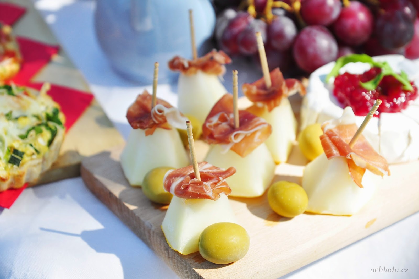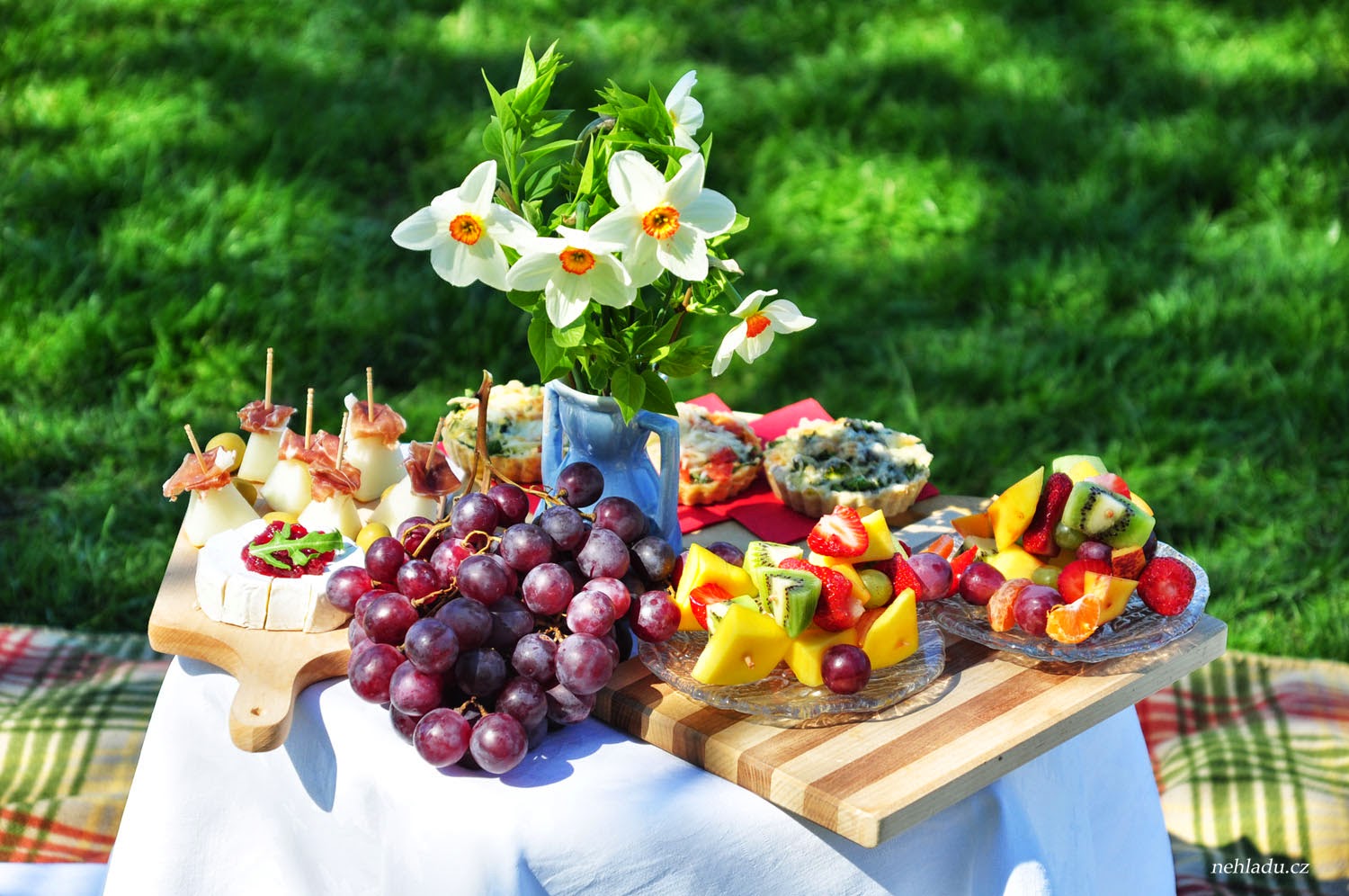 Ovocné špízy a trs hroznového vína, které skvěle doplňovaly slaná jídla. Ideální dezert ve slunečný den.