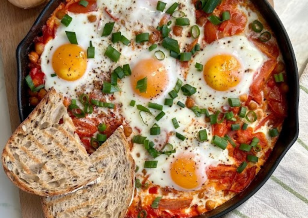 Na rozehřátem oleji nechte zesklovatět nadrobno nakrájnou cibuli. Přidejte nadrobno nakrájenou čerstvou papriku a krátce restujte. Poté přidejte prolisovaný česnek, římský kmín a mletou papriku a jen krátce restujte, aby koření nezhořklo. Následně přidejte rajský protlak, zamíchejte a přidejte rajčata a propláchnutou cizrnu. Vše smíchejte a osolte a opepřete dle chuti. V hotové směsy vytvořte důlky a vyklepněte do nich vejce. Směs nechte vařit pod pokličkou na mírném ohni, nebo vložte do trouby předehřáté na 180 °C na tak dlouho, doku nebudou bílky tuhé a žloutky lehce tekuté. Hotový pokrm posypte nasekanými bylinkami a podávejte s pečivem.
