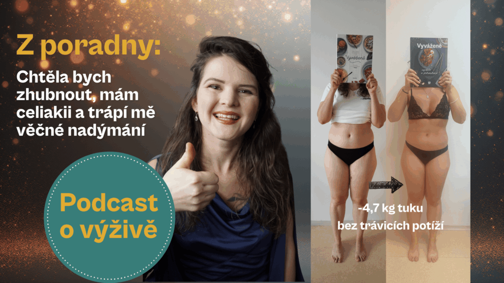 Ve 107. díle podcastu O výživě si můžete pustit sestřih z konzultací s klientkou, která k nám přišla s cílem zhubnout a probrat možná řešení jejích trávicích potíží. Kromě toho má od svých 12 let celiakii. Jednalo se o 28letou učitelku, která vážila 68,2 kg při výšce 164 cm. Pohybu měla ve svém režimu dostatek, ale často jedla větší množství tuku a chyběly jí v jídelníčku svačiny, což řešila sladkým.