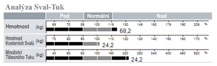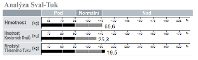 Vidíme o něco vyšší hmotnost, než je norma, a to zejména kvůli vyššímu množství tukové tkáně – svaly jsou v prostředku normy. Cílem je tedy redukce, aby se klientka dostala do ideálních hodnot, měla by zhubnout 6-10 kg tuku, což také odpovídalo její představě.