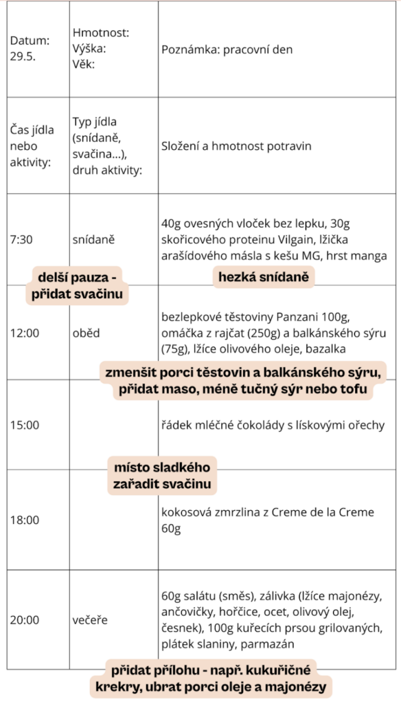 Stejně jako každý, kdo přijde k nám do poradny probrat svůj jídelníček, si i tato klientka zapisovala své aktuální jídelníčky. Ty jsme si společně zhodnotili a ukázali si na nich, kde bude vhodné udělat změny. Pokud vás zajímají všechny jídelníčky, které jsme s klientkou probíraly po celou dobu spolupráce, najdete je na našem herohero.co/nehladu.