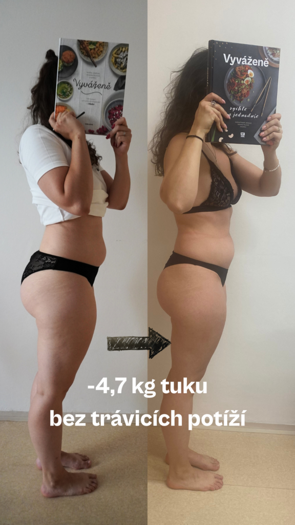 A výsledek? Lepší představa o tom, které potraviny klientce nedělají dobře a na co si má dávat pozor třeba při stravování v restauracích. Hlavním viníkem se nakonec zdála být čerstvá cibule – a tak ji klientka doma přestala používat. Zhubla 4,7 kg tuku a nabrala 1,1 kg svalů, čímž se dostala skoro do vytouženého cíle, a to i přes to, že ji překvapilo poměrně náročné období v práci, které by v minulosti řešila dojídáním se sladkostmi. Díky naší spolupráci si však osvojila zdravější návyky, které byla schopna aplikovat i ve stresující období, což je v důsledku to nejdůležitější.